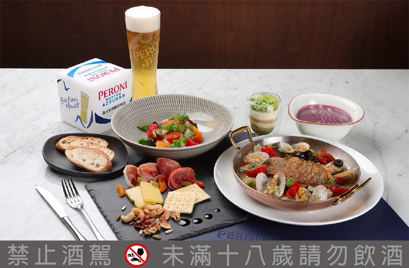 PERONI沛羅尼生啤酒330ml乙杯,加價400元享升級PERONI沛羅尼生啤酒無限暢飲,舌尖弛徜義大利亞得里亞海的身心靈放鬆!(以上定價需另計10%服務費)