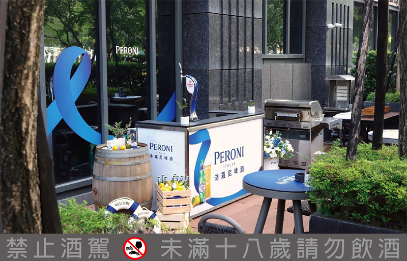PERONI品牌更於SEEDS大地全日餐廳的露檯秘境用餐區,設計佈置期間限定的戶外小酒館,同樣以海洋為靈感使用藍白色調佈置打造義國風情,為夏日注入涼爽感。現場提供現壓PERONI沛羅尼生啤酒, 週末加碼暢飲優惠,PERONI的清檸果香伴隨著高雄港灣夏夜晚風,實踐「義式慢活」美學,以小酌開啟美好生活的PERONI Lifestyle!