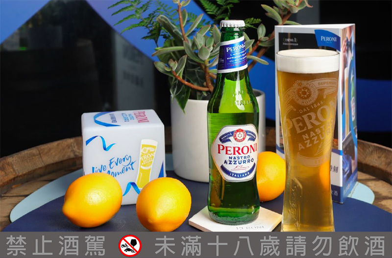 aohsiung.com/PERONI。主題房內獻上PERONI啤酒與專屬品牌玻璃杯試飲體驗,豐沛的檸檬清香與細緻碳酸口感,微苦不膩的清新尾韻與優雅香氣,感受夏季清爽消暑的頂級享受!