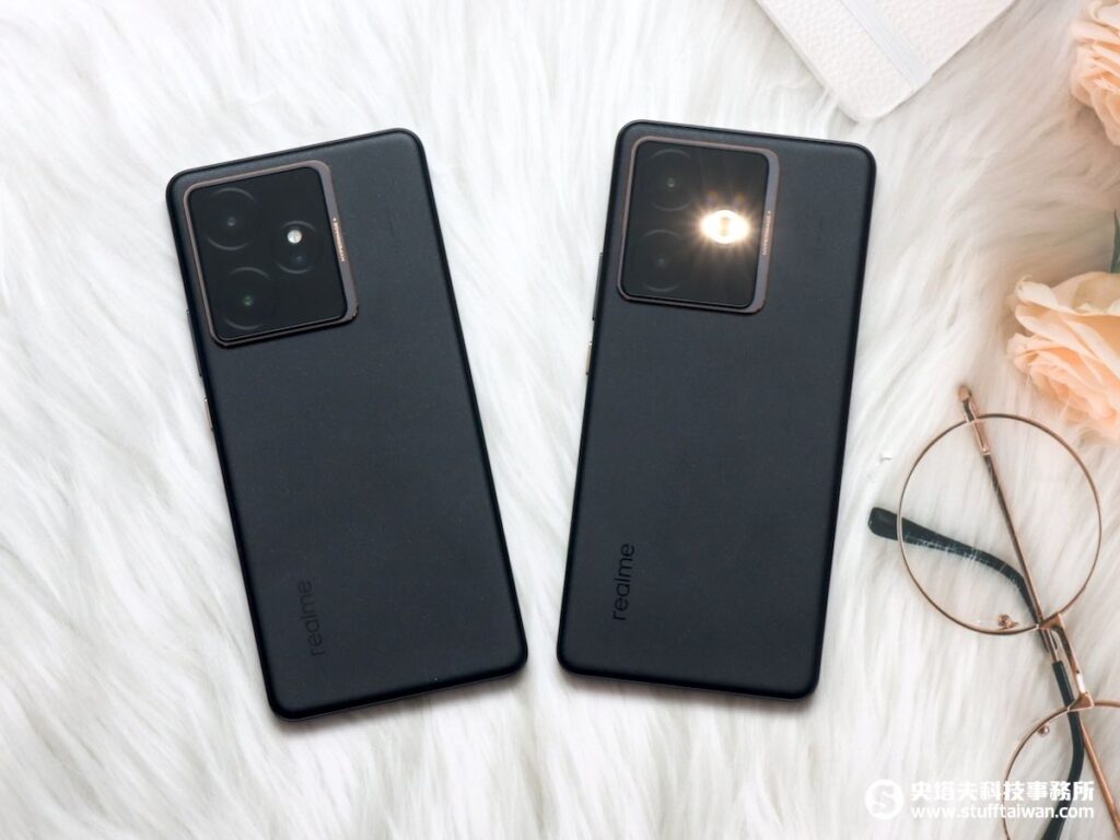 realme GT 7系列的凜冽黑,以玻璃纖維與石墨烯無縫融合,雲母顆粒就像是極地岩層上閃爍的冰晶,展現極致的黑色美學。兩款手機的外觀幾乎相同,可用背面的閃光燈與鏡頭模組來判別,左邊的realme GT 7擁有三鏡頭與較小的閃光燈,右邊的realme GT 7T擁有雙鏡頭與較大的閃光燈。realme更研究遊戲玩家的握持偏好,後蓋採用遊戲滑鼠的表面塗層,具有親膚、防滑的觸感,帶來隨時出擊的穩定操作手感。