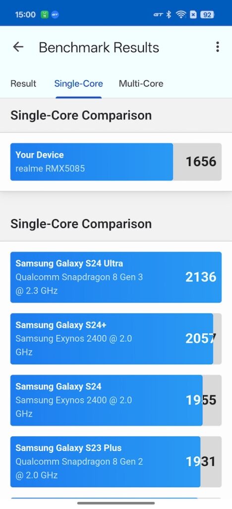 GT 7實測安兔兔V10.4.9得到171萬分,接近官方數據的176萬分,在排行榜上接近Snapdragon 8 Gen 3與天璣9300+,以次旗艦處理器而言性能分數表現相當高。