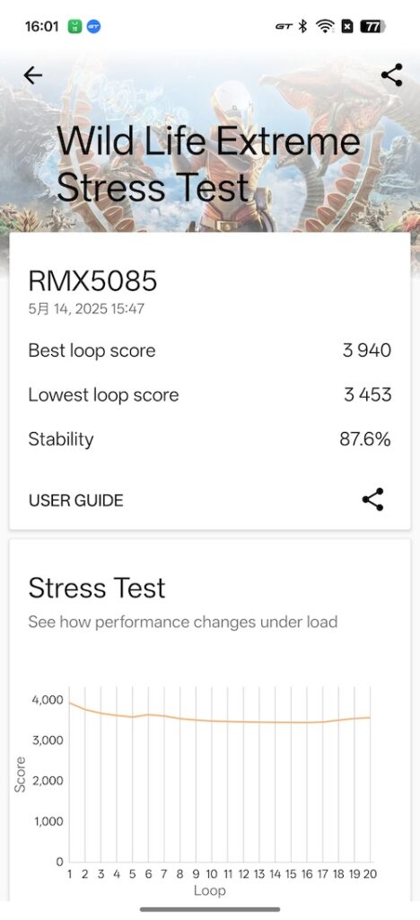 GT 7T跑3Dmark-Wild Life Extreme壓力測試20分鐘,穩定度更高達87.6%,期間電量從89%降為77%、溫度從30度上升到40度。