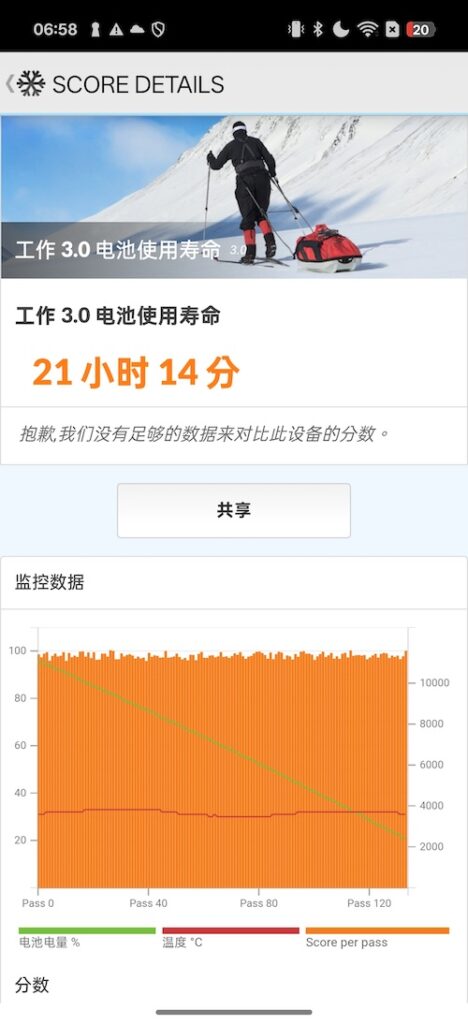 GT 7T使用PCmark工作3.0電池使用壽命來實測續航,螢幕設為120Hz時得到21小時14分、設為60Hz時得到22小時27分,螢幕一直亮著將近能使用一天。