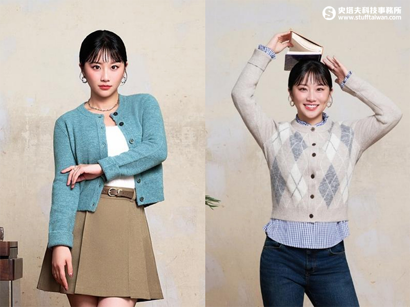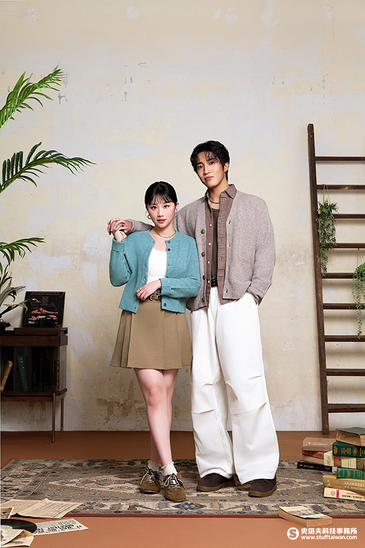 婁峻碩以淺棕色V領開襟外套搭配同色系襯衫,展現秋冬低調層次感;另一套粉嫩新色外套搭配白T與飾品,營造溫暖親和的暖男形象。焦凡凡則以菱格紋圓領針織外套搭配藍格襯衫,展現優雅學院風;另一套湖水綠開襟外套搭配卡其百褶裙,則散發俏麗活潑氣息。