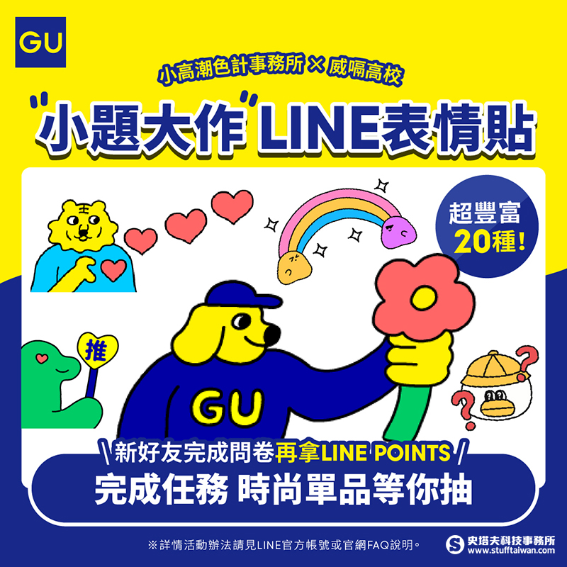 民眾只要於主題列車拍照打卡並完成指定任務,即有機會抽中兩位藝人同款針織外套或限量簽名拍立得,為連假出遊增添驚喜與話題。此外,GU 也同步攜手超人氣插畫家小高潮色計事務所與威嗝高校,推出「小題大作」聯名 LINE 表情貼。
