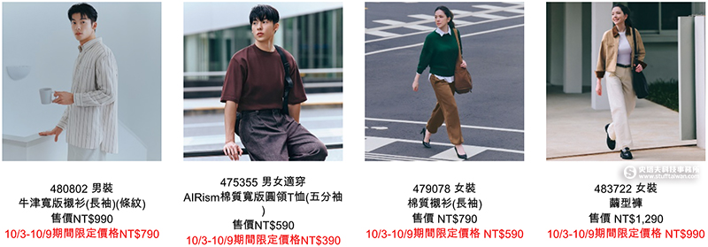 本次檔期亮點15周年品牌大使許瑋甯同款也是韓國社群媒體洗版單品「女裝繭型褲」限定優惠價NT$990;15周年品牌大使許光漢著用款「U AIRism棉質寬版圓領T恤」限定優惠價NT$390,機能與時尚兼具,成為秋季出遊穿搭首選。