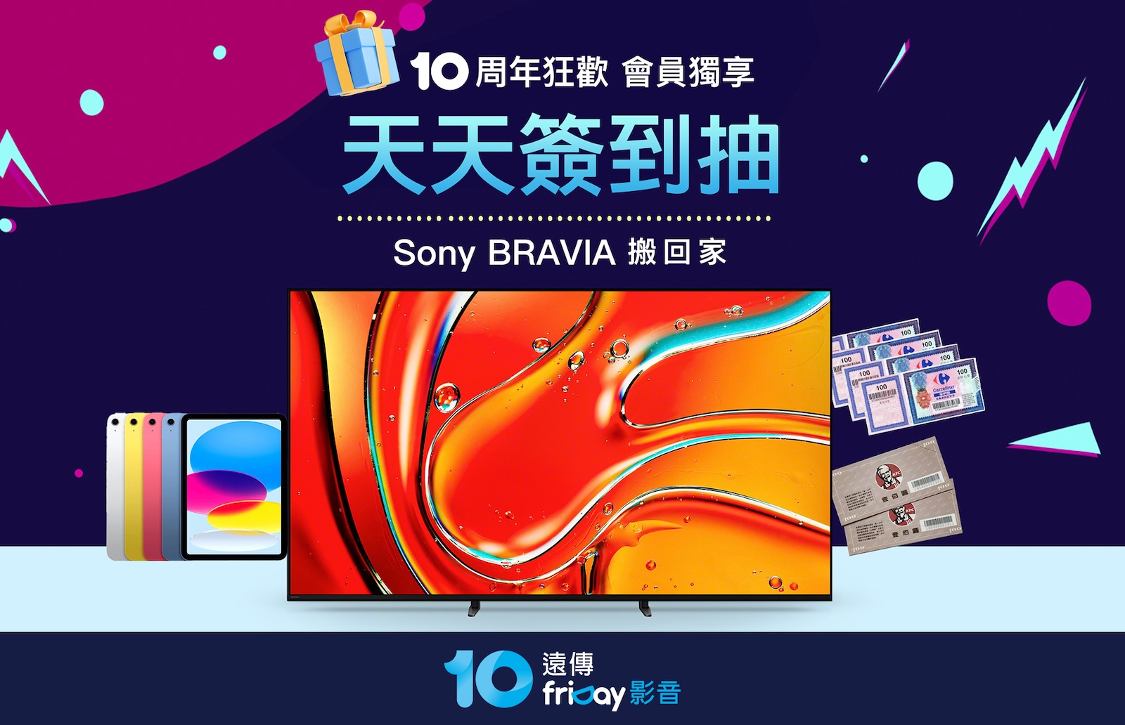 - 簽到抽大獎: 會員即日起至 10/29 每日登入參加「天天簽到活動」,即有機會抽中價值近 6 萬元的 Sony BRAVIA 頂級 MiniLED 智慧顯示器、iPad 等豪華大獎。