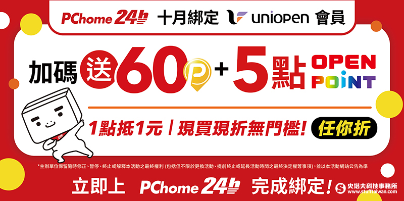 為歡慶PChome 24h購物正式合作uniopen會員生活圈,即日起至10月31日,只要上PChome 24h購物完成uniopen會員帳號綁定,即可享雙重超值回饋,除了獨家贈送60 P幣之外,再加碼送5點OPENPOINT,數量有限,送完為止。