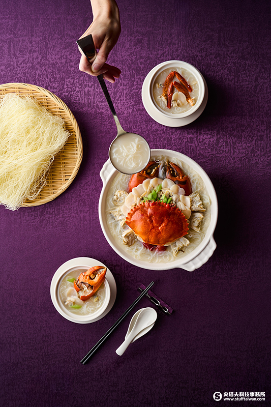 今年新登場的秋蟹料理中,首推由紫艷中餐廳營運主廚──郭偉雄匠心研發的「酒香鮮蛤煮沙公米粉湯」,選用台灣人喜愛的日本清酒為基底,融入肥美蛤蠣、干貝與沙公細火熬煮出澄澈甘鮮的湯頭,待海味精華釋出再放入米粉燉煮,吸收湯汁後柔韌帶勁,飽含旨味;頂層鋪上全隻沙公、鮮干貝、去殼蛤蠣肉與翠綠絲瓜,每鍋四至六人份,既是飽餐主食、亦為暖胃湯品。