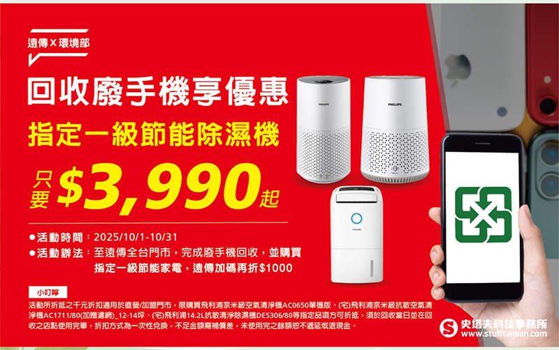 於手機回收月期間,不限遠傳用戶只要持家中故障、閒置的廢棄手機,至遠傳實體門市完成回收,就可獲得指定節能家電購物金1,000元。在遠傳門市購買飛利浦奈米級空氣清淨機、抗敏清淨除濕機等指定一級節能家電,現買現折,最低只要3,990元就能帶回家!