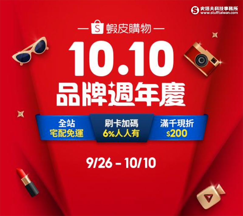 為感謝消費者一路以來的支持,蝦皮購物特別推出年度最強「10.10 品牌週年慶」,即日起至10 月 10 日推出「免運無限次」、「刷卡加碼 6% 回饋」、「滿千折 200元」三大重磅優惠,全面回饋用戶。