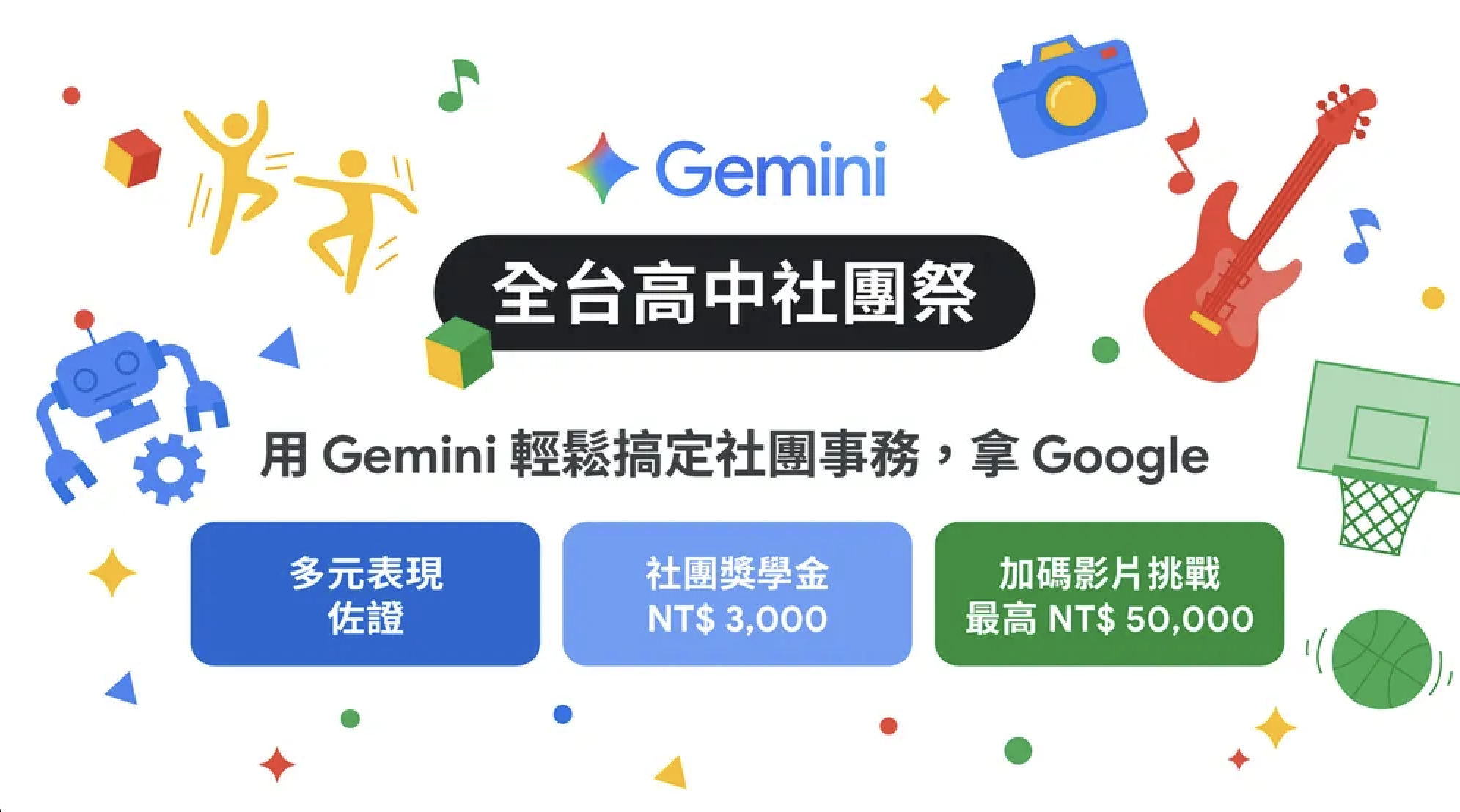 為了更早啟發年輕世代對 AI 的想像與應用,Google 也特別針對台灣的高中生,推出「全台高中社團祭」活動。Google 邀請全台灣的高中社團,讓 Gemini 成為社團的「神社員」,一同探索 AI 如何為社團活動帶來更多火花,還能在課外活動的學習歷程中,加上獨特的多元表現。活動辦法非常簡單: