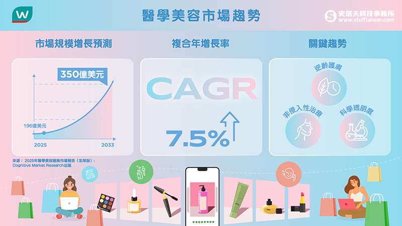 全球美容市場正迎來前所未有的轉變,研究報告顯示,預估全球醫美護膚市場將自2025年的196億美元快速成長至2033年的350億美元,年均複合成長率達7.5%。[1]