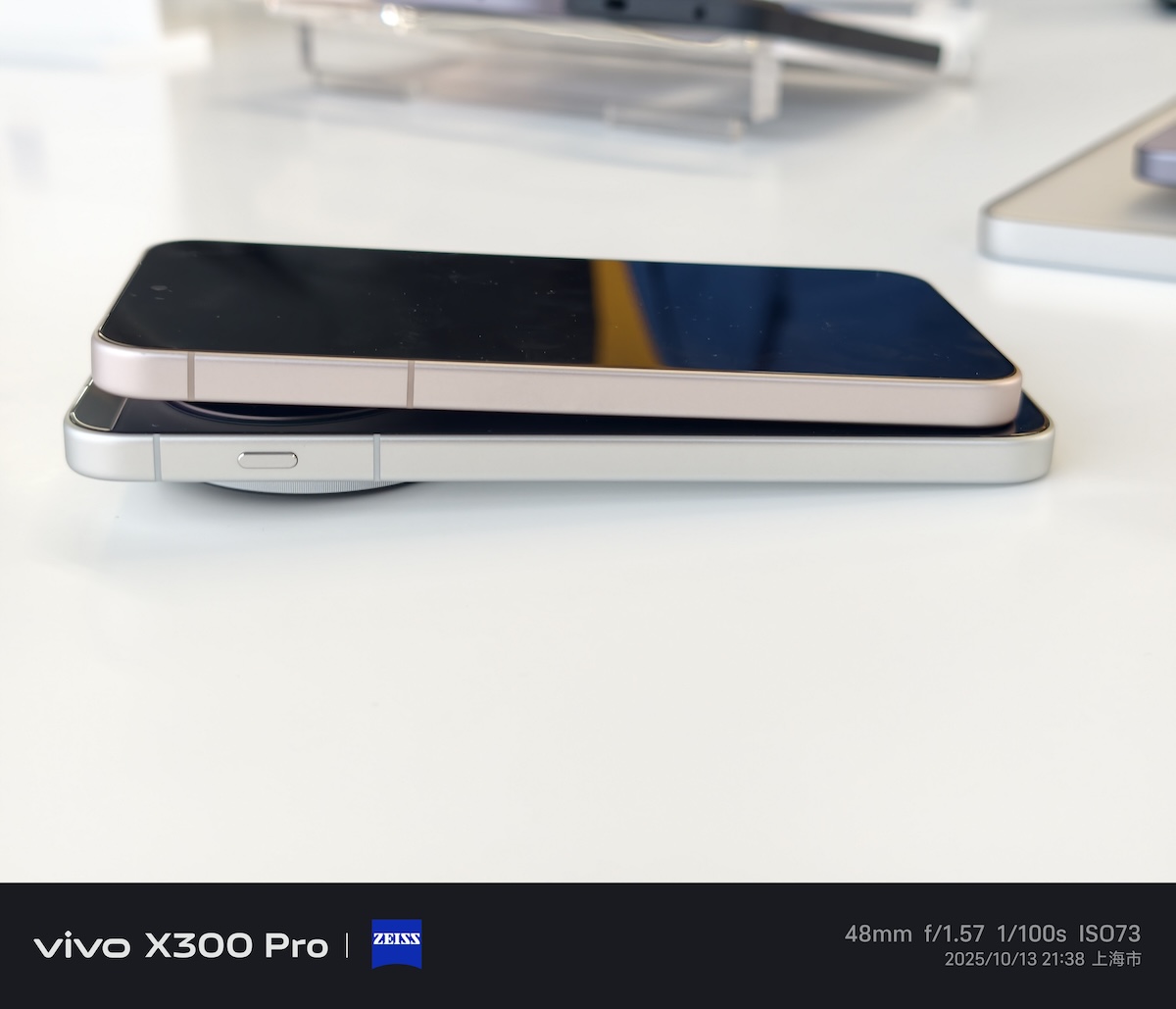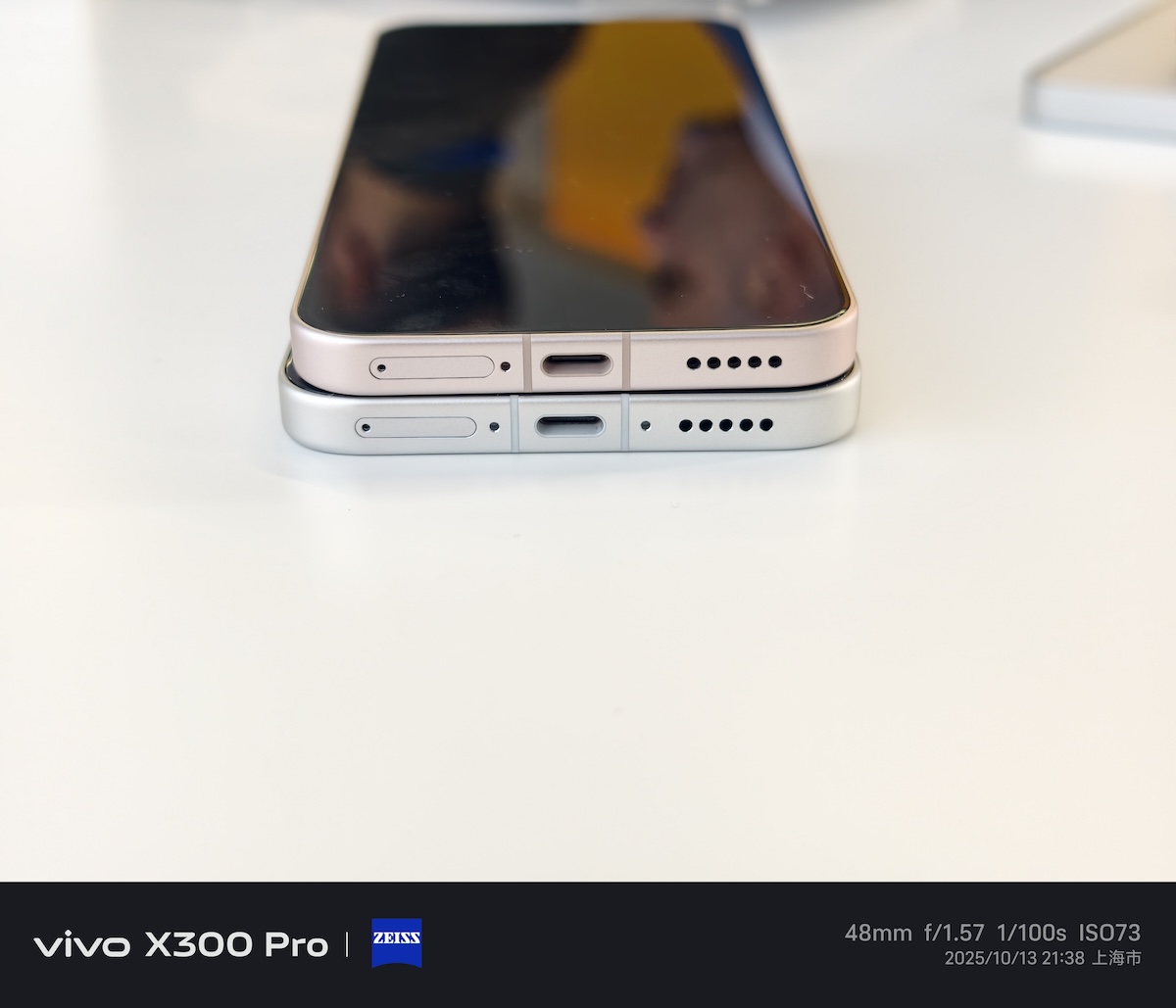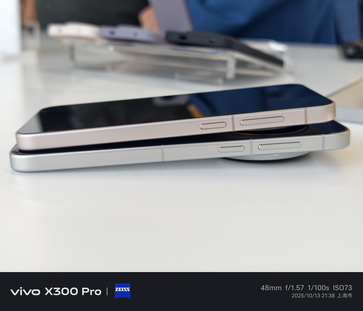機身右側比較,X300與X300 Pro音量鍵與電源鍵位置相同,X300晨曦粉的中框是淡淡的粉紅色,X300 Pro雪峰白搭配銀色中框。X300的機收厚度是7.95mm、重量190g,X300 Pro的機身厚度是7.99mm、重量225g。
