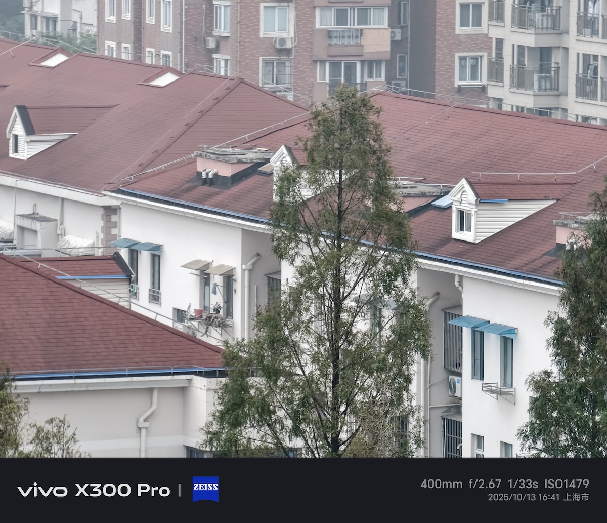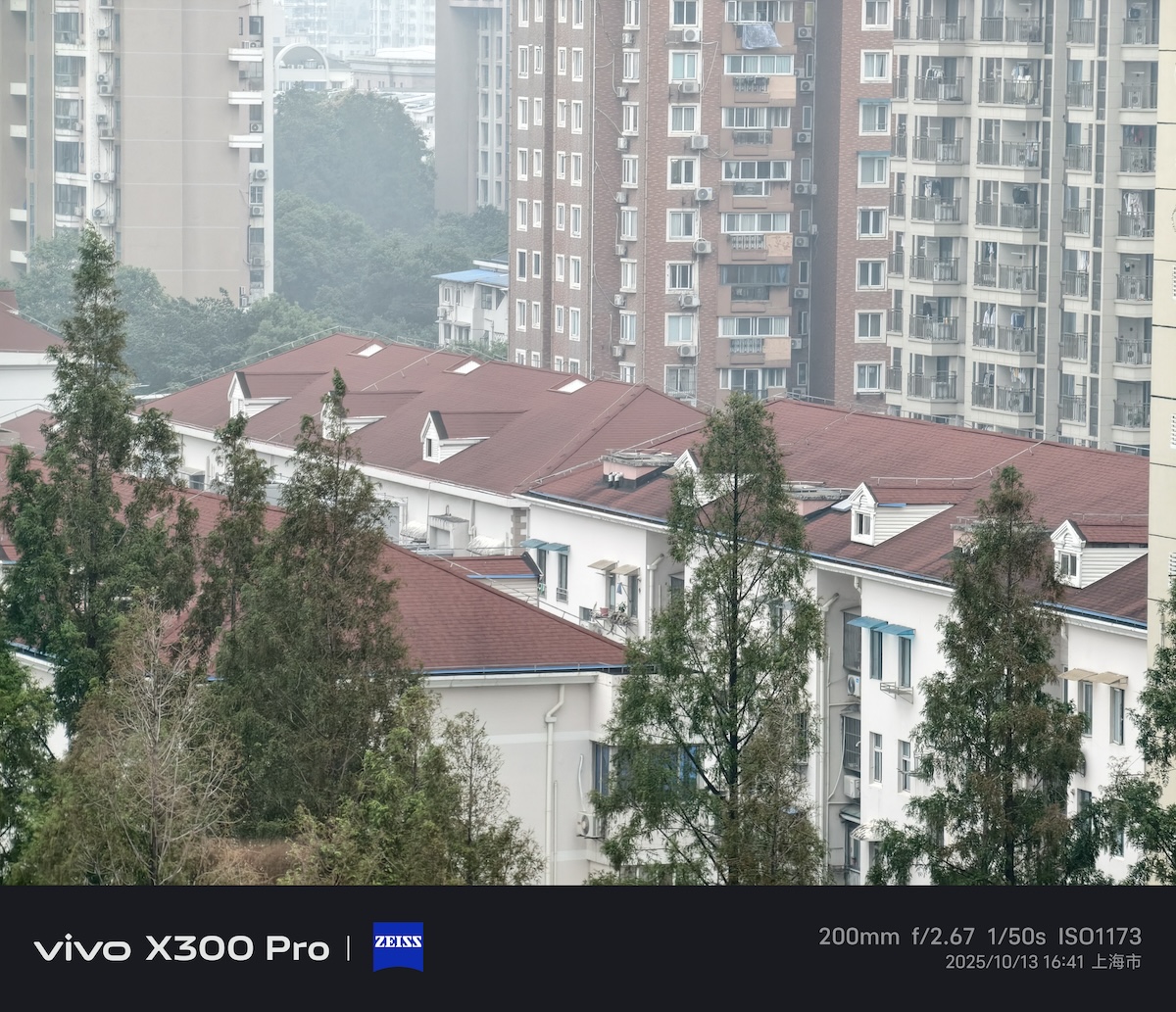 在上海環球港凱悅酒店使用X300 Pro搭配增距鏡,拍攝對面的社區,因為空氣品質不佳,看起來濁濁的。