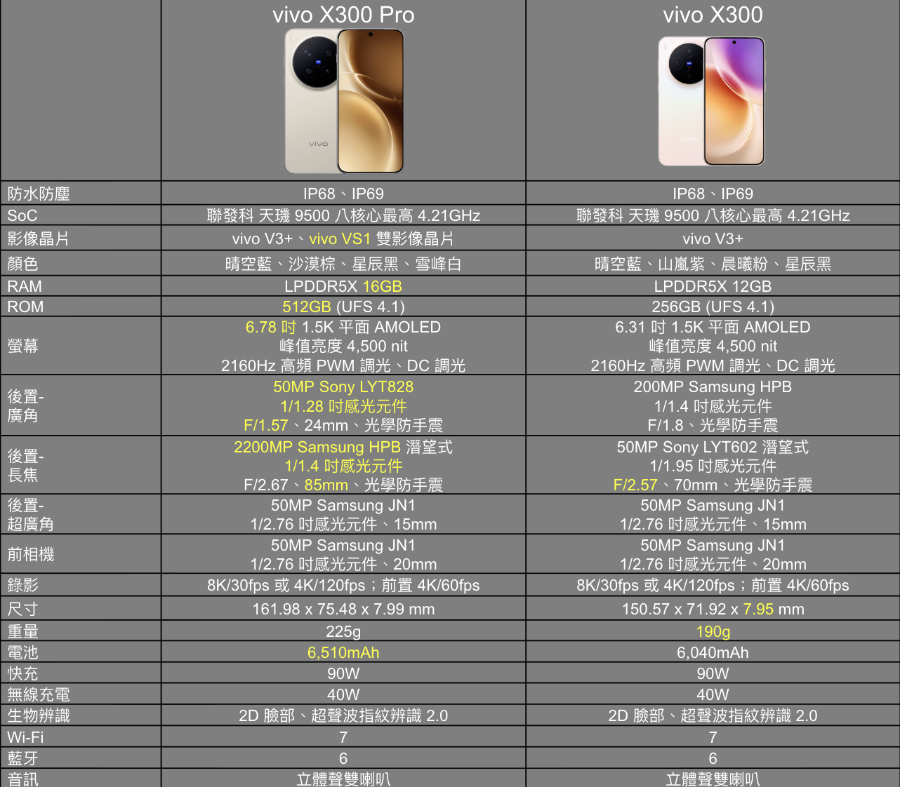 星辰黑、雪峰白(限量),台灣X300 Pro預計推出16GB/512GB的版本。以下的X300 Pro顏色名稱,都會改用台灣命名來敘述。