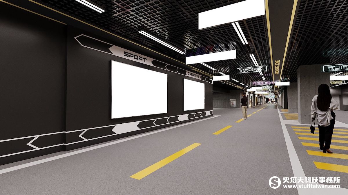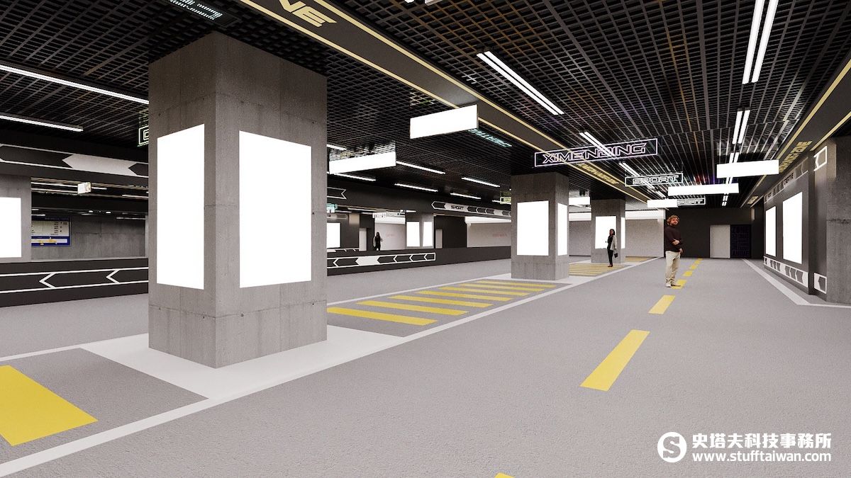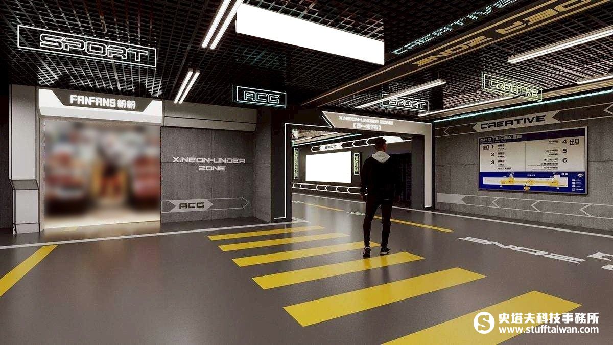 設計上,團隊以都會潮流為基調,大膽捨棄傳統的花崗岩風格,改用簡約且具現代感的深灰色為主體。原先的柱體被大型LED螢幕覆蓋,將全天候播放各式影音內容;天花板則以黑底搭配亮彩與霓虹線條點綴,而地板上獨特的斑馬線與車道線設計,巧妙融入了「地下城」的概念,讓遊客一踏入,便彷彿穿越到另一個次元。