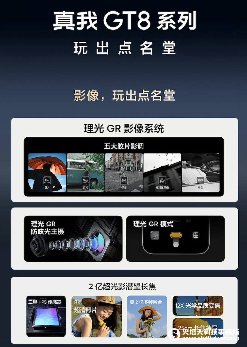 GT8 Pro最大亮點在於與日本經典相機品牌RICOH合作,推出 「realme × RICOH GR」 聯名影像,以「手機中的GR」為理念打造專業攝影體驗,推出正片、負片、標準、高對比黑白、單色五種影調,主相機還有理光防眩光,在理光GR模式中可拍攝28mm與40mm兩個經典焦段。搭載三鏡頭組合: