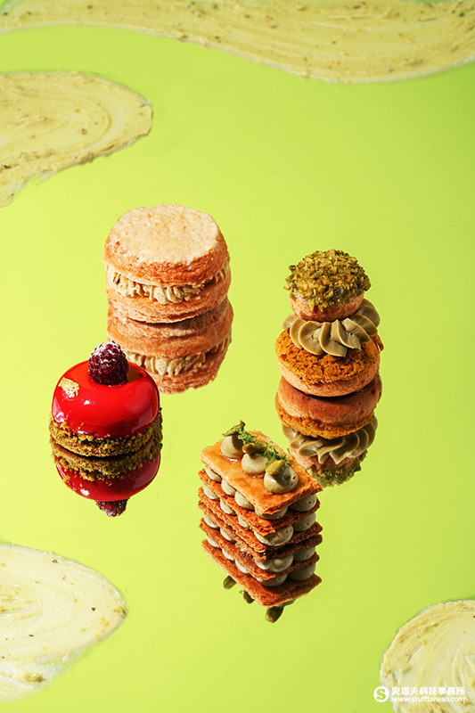 「開心果卡士達拿破崙派」的酥脆派皮裹上糖衣後烘焙,夾以濃郁的開心果卡士達、刨上少量檸檬絲解膩,演繹法式經典的優雅氣韻。