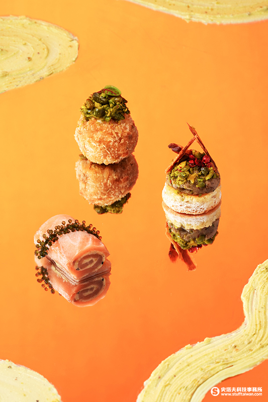 開心果的百搭特色在鹹食上亦發揮得淋漓盡致,一口咬下「脆培根、巧克力開心果杏桃醬」,首先感受底部以澄清奶油香煎的瑪芬蛋糕,與頂層烤至酥脆的培根相呼應;中間配料除了開心果奶酥醬外,特別選用酸甜杏桃果乾、巧克力與椒鹽粉組成,調和甜醬與肉品的風味平衡,最後撒上紅胡椒碎妝點明豔色澤,綻放魅力風華。
