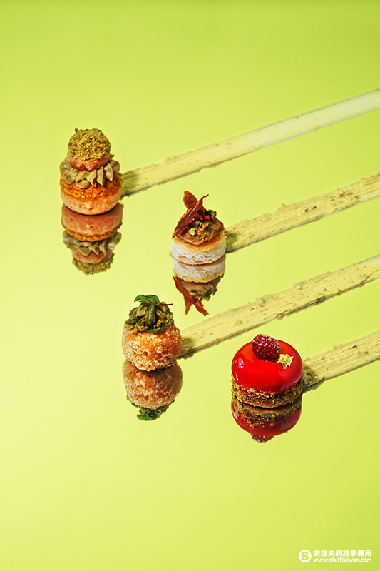 而台北W飯店甜點專家──何玉梅則將開心果的獨特滋味結合多元食材與技法變化,推出以雙層結構展現精緻美學的「開心果白巧克力修女泡芙」,大顆泡芙包裹開心果香緹,表層佐以烏龍茶葉酥凸顯雅致香氣;小顆泡芙則填入白巧克力香草餡、頂端灑上開心果碎,再以開心果奶霜細膩銜接兩者。