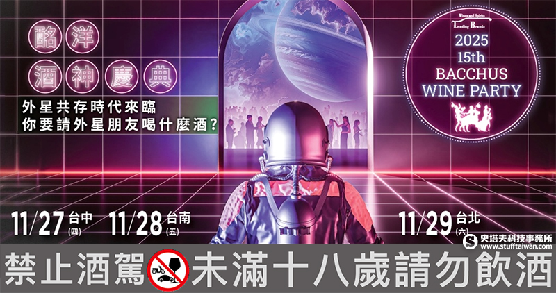 酒界年度盛事2025 BACCHUS Wine Party第十五屆酩洋酒神慶典即將於2025年11月27日至11月29日在北中南三地盛大舉辦葡萄酒派對,今年以「外星共存時代來臨—你會請外星朋友喝什麼酒?」為主題,邀請全台葡萄酒愛好者共赴一場沉浸式銀河微醺派對。
