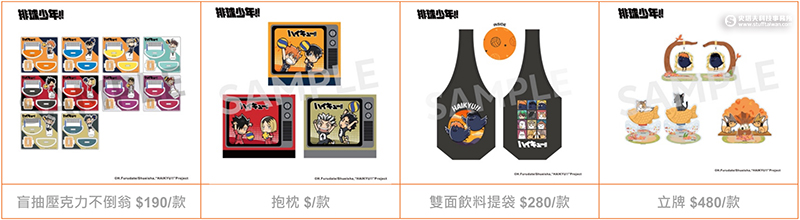 這次推出的十款「盲抽壓克力不倒翁」,集結日向翔陽、及川徹、黑尾鐵朗等十位角色,看他們在桌面上來回擺動,就彷彿在努力自主練習一樣,讓人愛不釋手!還有三款熱門搭檔的「抱枕」化身為最暖應援,無論下班回家或宅在家,都給你滿滿的暖心!作品中不同角色間的強烈羈絆也延伸進了日常生活,讓吉祥物們化身為實用又可愛的好夥伴!「雙面飲料提袋」推出日向烏鴉與影山烏鴉款,以及集結12隻吉祥物的全員大集合款,不論是外出練球或是日常通勤,都能隨身攜帶,讓你提著最熱血的應援與元氣出發!還有超萌「立牌」將研磨貓咪與黑尾貓咪經典搭檔立體化,擺在桌上讓最喜歡的組合給你療癒滿點。