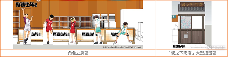 門口處則有音駒的孤爪研磨、青葉城西的及川徹、白鳥澤學園的王牌牛島若利等五位人氣角色熱情迎接,一旁還能看到經典的「坂之下商店」大型扭蛋區等著粉絲試試手氣,看看誰能把A賞帶回家!