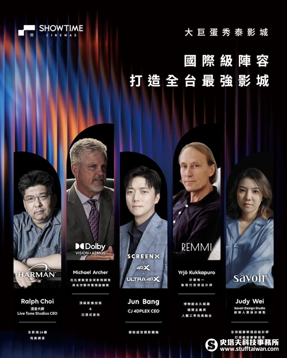 秀泰影城集結國際級大師陣容,特別邀請韓國知名聲音指導、曾為電影《寄生上流》操刀的崔太永負責全影城調音。他以細膩聲場與立體定位見長,結合全影城採用的Harman音響系統,讓每一個影廳都具備國際級的沉浸聲學體驗。此外,CJ 4DPLEX 北美首席執行長 Donald Silvio Savant 和杜比實驗室內容與行業合作總監 Alex Or 也親自來台,為自家的 SCREENX、ULTRA 4DX 與杜比視界 + 全景聲影廳助陣。Savant 表示,台灣觀眾對影像體驗的熱情令人印象深刻,期待透過大巨蛋秀泰影城,將最先進的沉浸式觀影科技帶給更多熱愛電影的消費者。