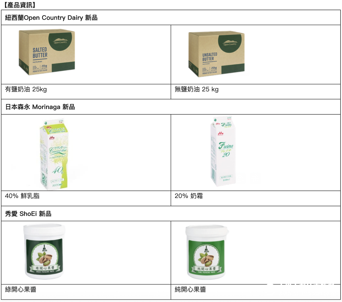 - 紐西蘭 Open Country 奶油 (獨家代理): 歷時兩年洽談,同興正式取得紐西蘭第二大乳品加工商 Open Country Dairy 奶油的台灣獨家代理權。該奶油採用巴氏殺菌優質乳源,經 Fritz 傳統攪拌工法製成,呈現天然純淨的飽滿乳香,將為台灣烘焙業帶來全新風潮。