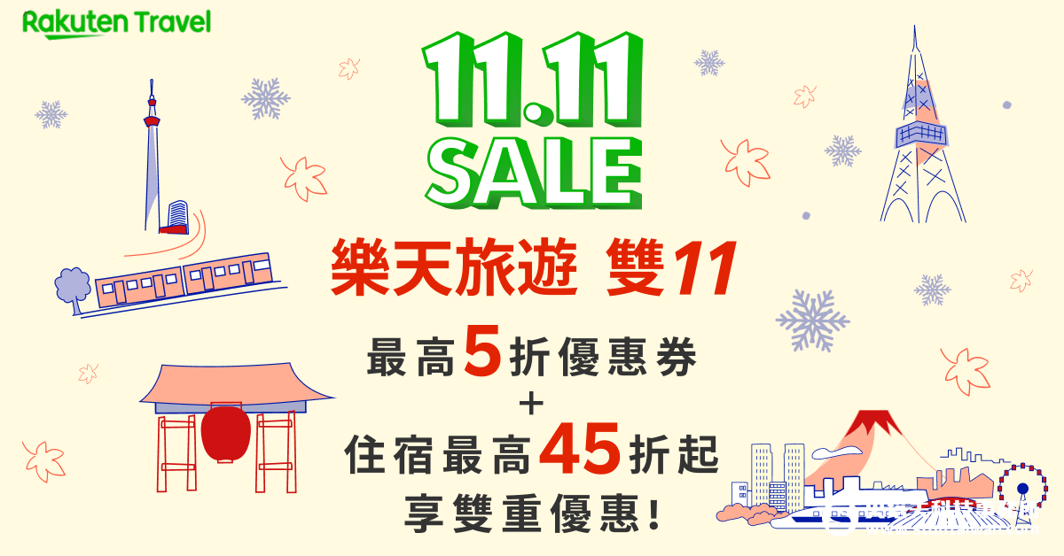 在 11 月 11 日當天,樂天旅遊除了限量 1,111 張最高 5 折券外,還可疊加住宿折扣最高額外再 45 折!輕鬆開啟日本旅程,從住宿到租車一次搞定。