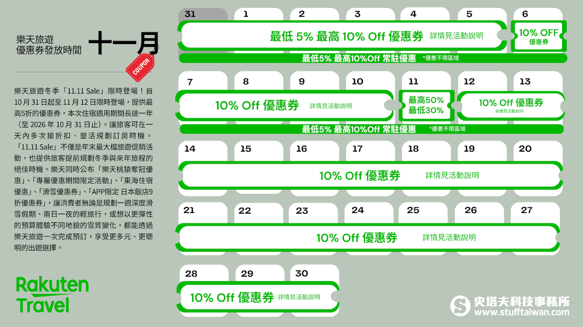 為此,樂天旅遊特別在 11 月 11 日當天推出破天荒的優惠,限量開搶 1,111 張超值折扣券,最高可達 5 折(限量 200 張),另有 6 折、65 折、7 折等快閃折扣。