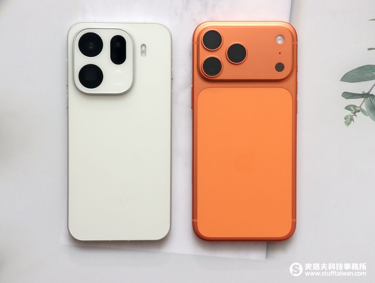 兩台的背蓋都是霧面不留指紋,Find X9 Pro採用矩形鏡頭設計,整體機身簡潔素雅;iPhone 17 Pro Max採用過中軸線、整塊凸起的鏡頭模組,搭配一塊拼貼玻璃,與一體成型的鋁金屬機身有色差,整體配色比較不一致。