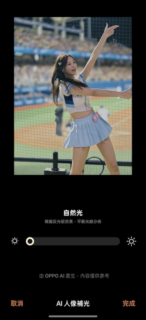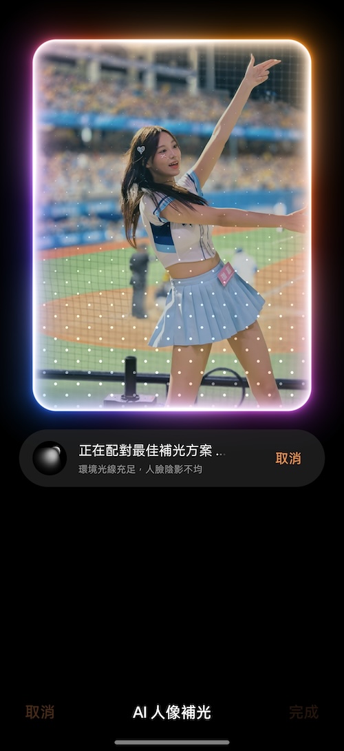 當我坐在靠近舞台的前排位置開啟「人像模式」,可以拍1x(23mm)、2x(46mm)、3x(70mm),最高拉到3.6x(85mm),主要用新推出的「霓虹」濾鏡實測。Angels們的笑容、被微風吹動的髮絲、以及隊服上的細節都被完整保留。AI對主體的摳圖精準,即便是快速擺動的手臂,也沒有出現明顯的「破綻」。背景虛化過渡自然,不是那種生硬的「高斯模糊」,主體突出且氛圍感十足。