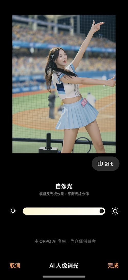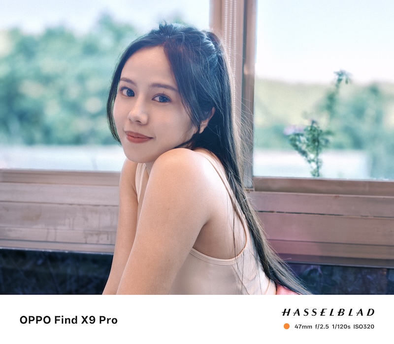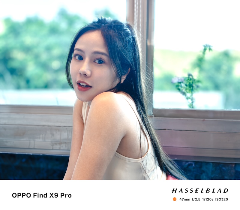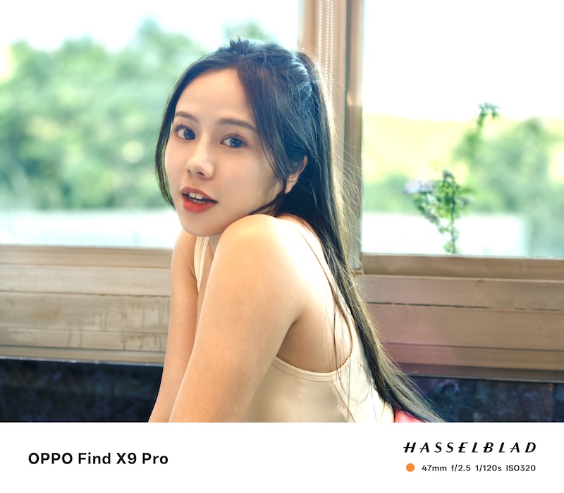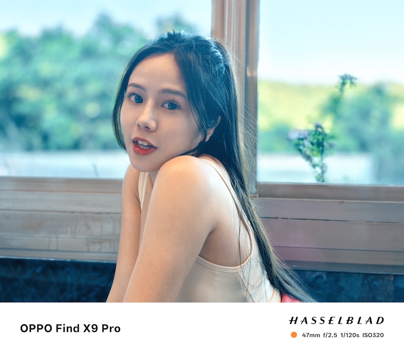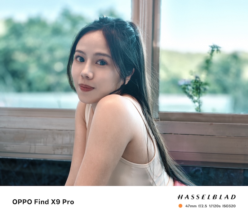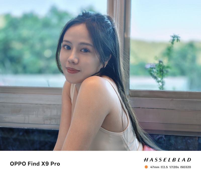 原圖雖然拍得很漂亮,但因為現場環境燈光,右臉下方有一塊陰影。透過Find X9 Pro內建的AI人像補光處理後,整體膚色更顯透亮,背景也不會死白。