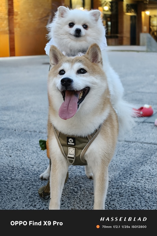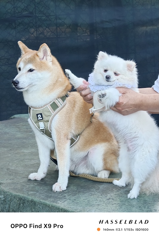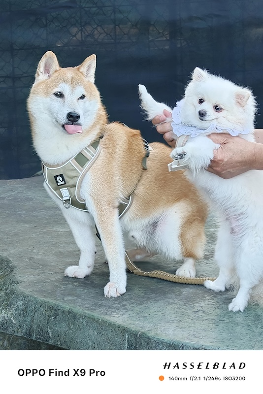 我帶著Find X9 Pro外出,拍攝朋友的柴犬及博美,成功鎖定了動物的眼睛或臉部,毛髮細節、眼神反光、笑容、舌頭吐出瞬間皆能被捕捉。尤其在光線充足的室外,毛色分層非常清晰。