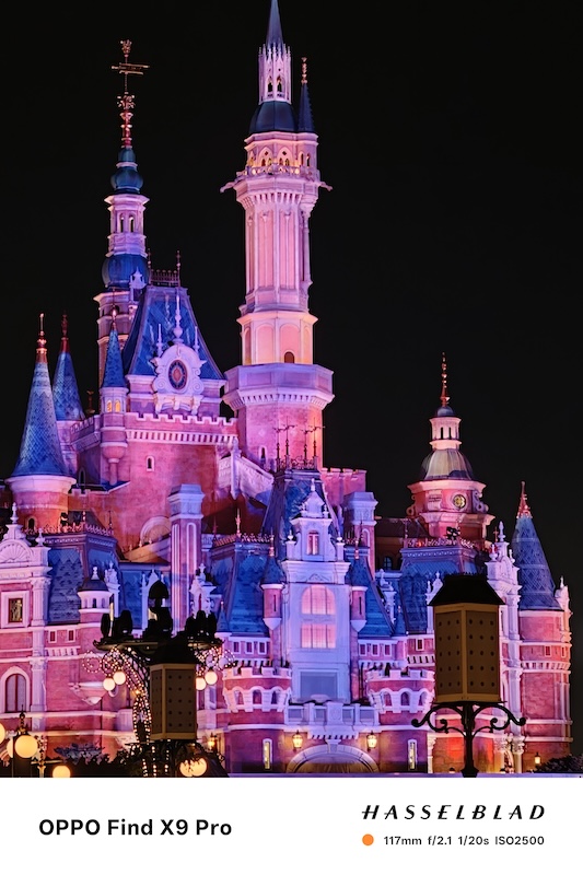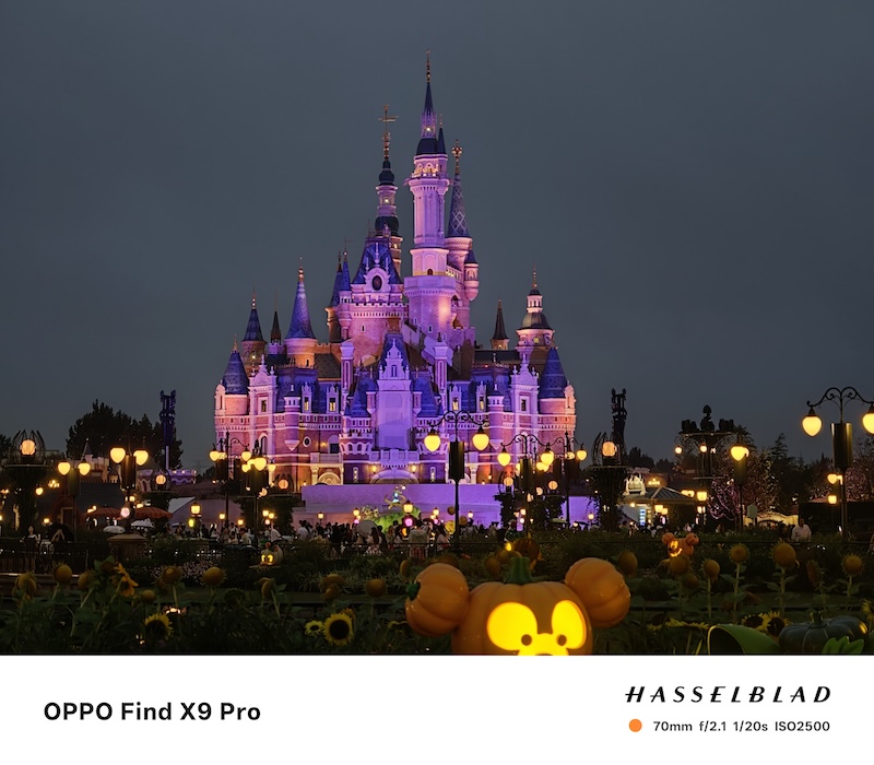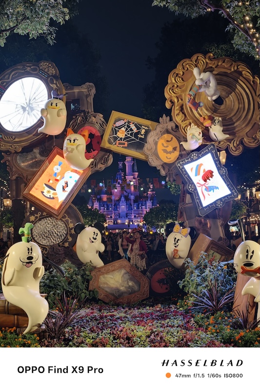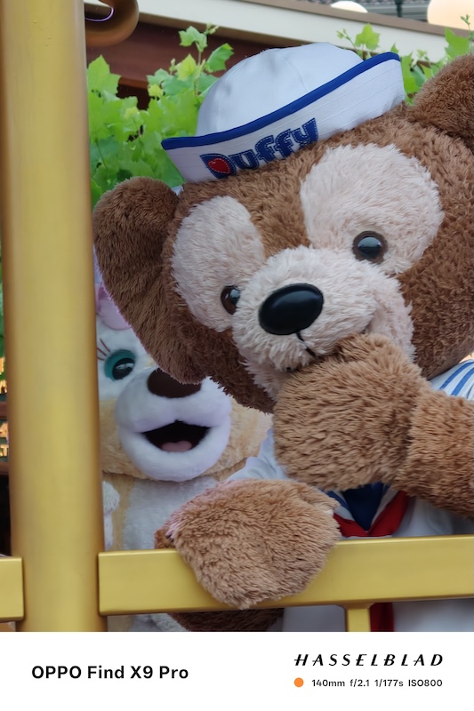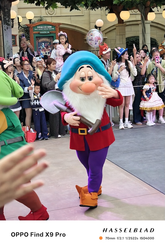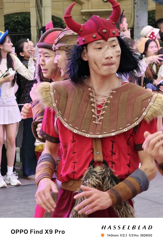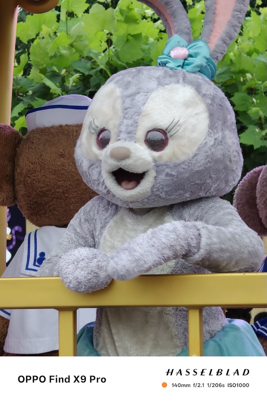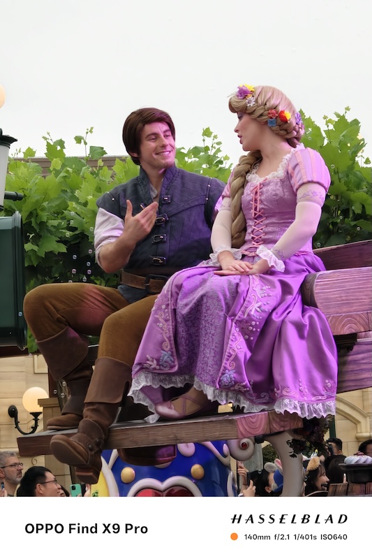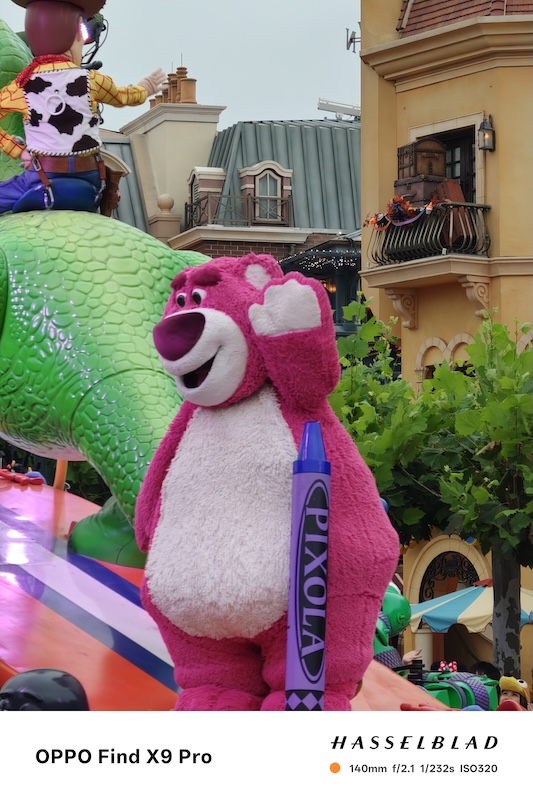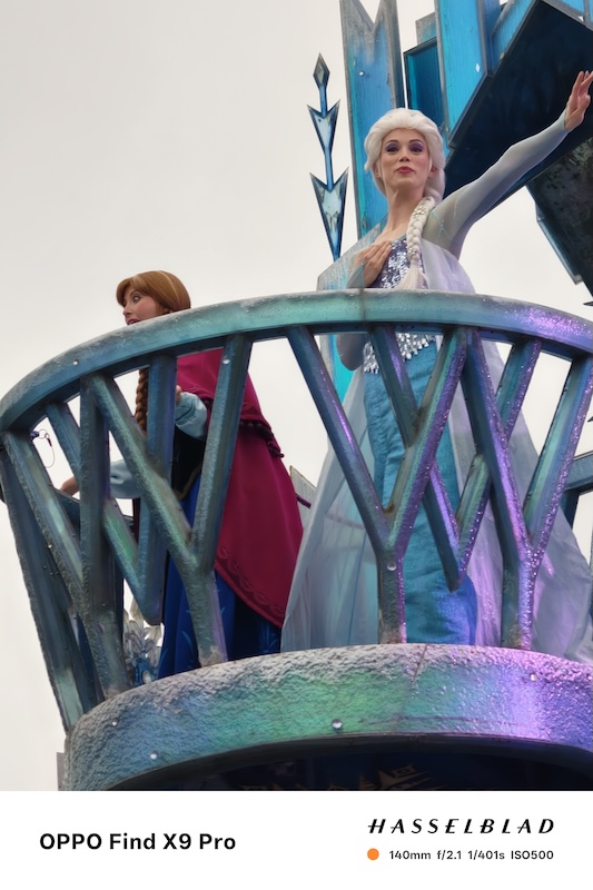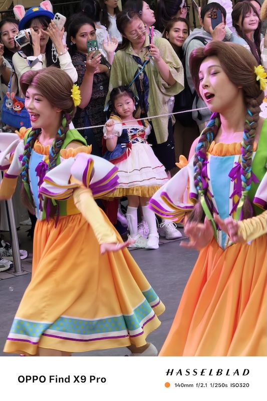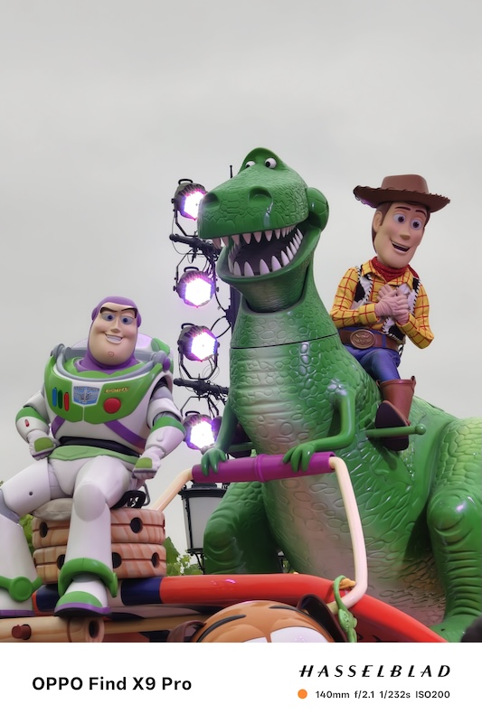 在陰雨天的上海迪士尼樂園,我站在人群後方。使用3x(70mm)只能拍到花車全景,無法突出角色,更多時候使用6x(約140mm)拍攝。可清晰拍到迪士尼角色們臉上的微笑、衣服上的亮片細節、甚至花車的紋理,感受到樂園的歡樂氛圍。以前在遊樂園都要事先排隊搶前面的位置,有了Find X9 Pro即使是後排也不用擔心。