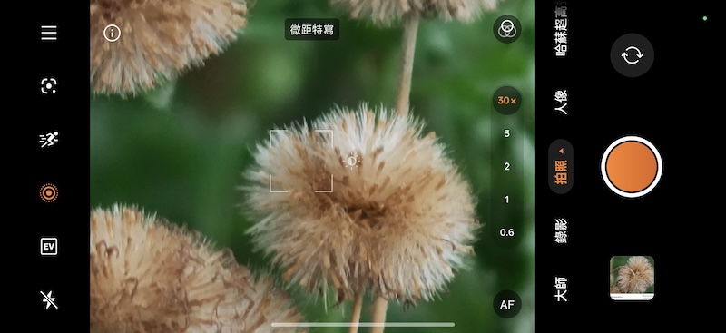 Find X8 Pro沒有長焦微距成為遺憾,Find X9 Pro補回長焦微距,在上方選單可開啟,支援自然虛化與全域清晰兩種特寫模式,最高支援30x的長焦微距。