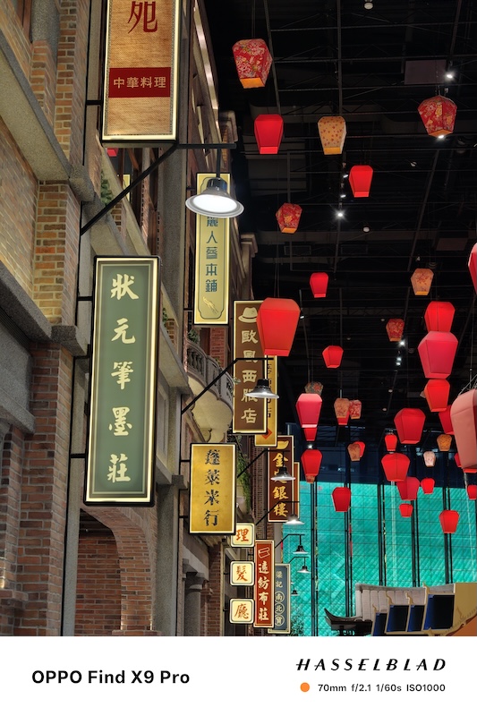 實際拍攝街景時,畫面中的高光部分,例如LED招牌或路燈,都能被穩定地控制在合適的亮度範圍內。Find X9 Pro對高光壓制的表現出色,文字邊緣銳利、光線不會外溢,也不會產生明顯鬼影,整體畫面保持乾淨且通透。當切換至長焦鏡頭進行夜拍時,就能感受到一定程度的限制。為了確保成功率,會自動提高ISO,雖然亮度有所補足,但同時也帶來了可見的細節損失。