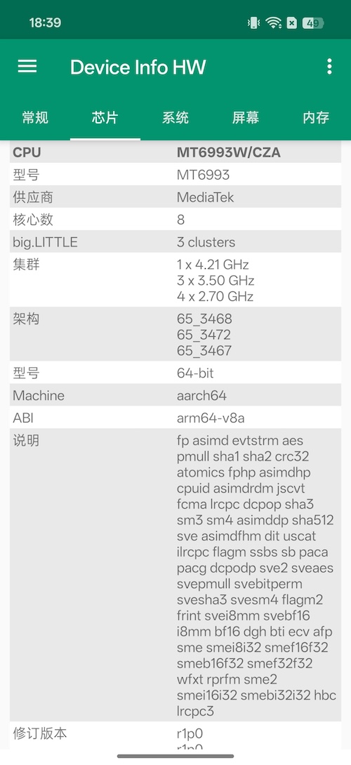 利用Device info HW查詢硬體資訊,天璣9500的架構是單核心4.21GHz+三核心3.5GHz+四核心2.7GHz。