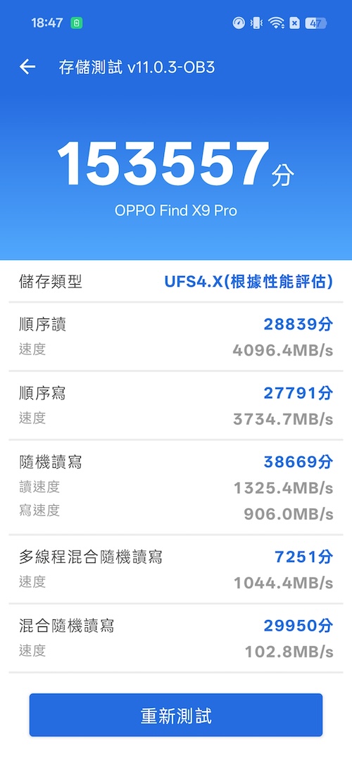 Find X9 Pro利用安兔兔跑儲存測試,讀取約4096.4 MB/s、寫入約3734.7 MB/s。