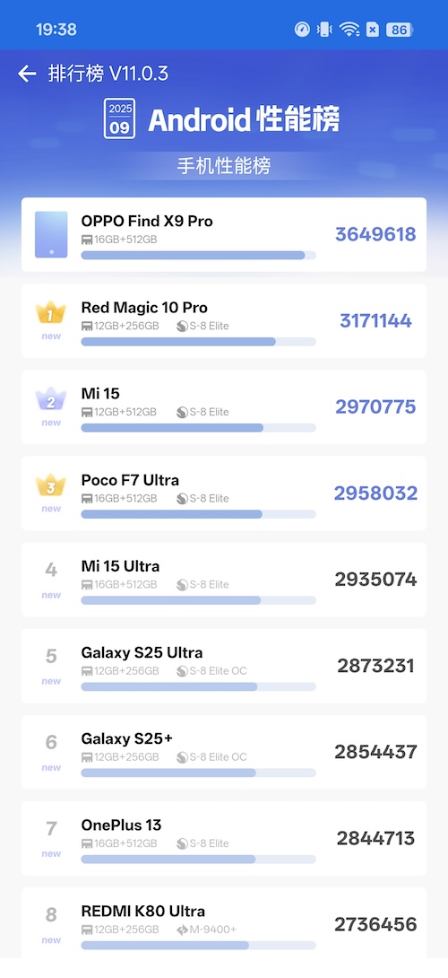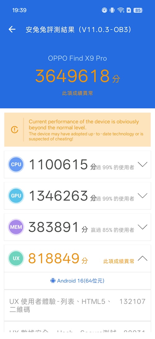 Find X9 Pro跑安兔兔V11得到364萬分,沒有官方宣傳的400萬分,或許要中國市場的1TB版本才有。
