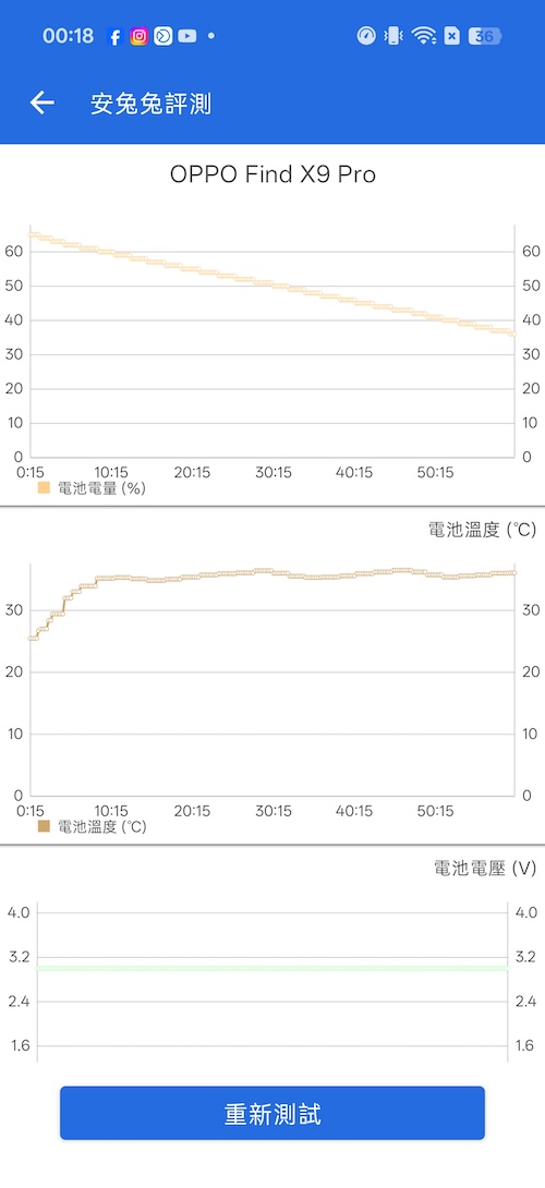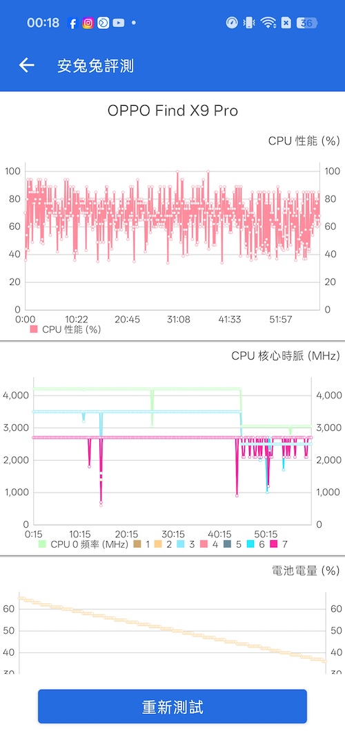 Find X9 Pro測安兔兔壓力測試1小時,約43分鐘後開始降頻,期間溫度從26度上升至約40度、電量從63%降為36%。