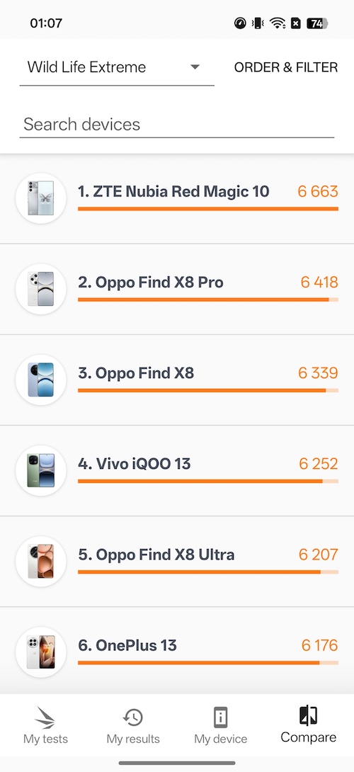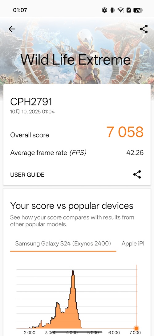Find X9 Pro跑圖形性能為主的3Dmark-Wild Life Extreme,得到相當高的7,058分。