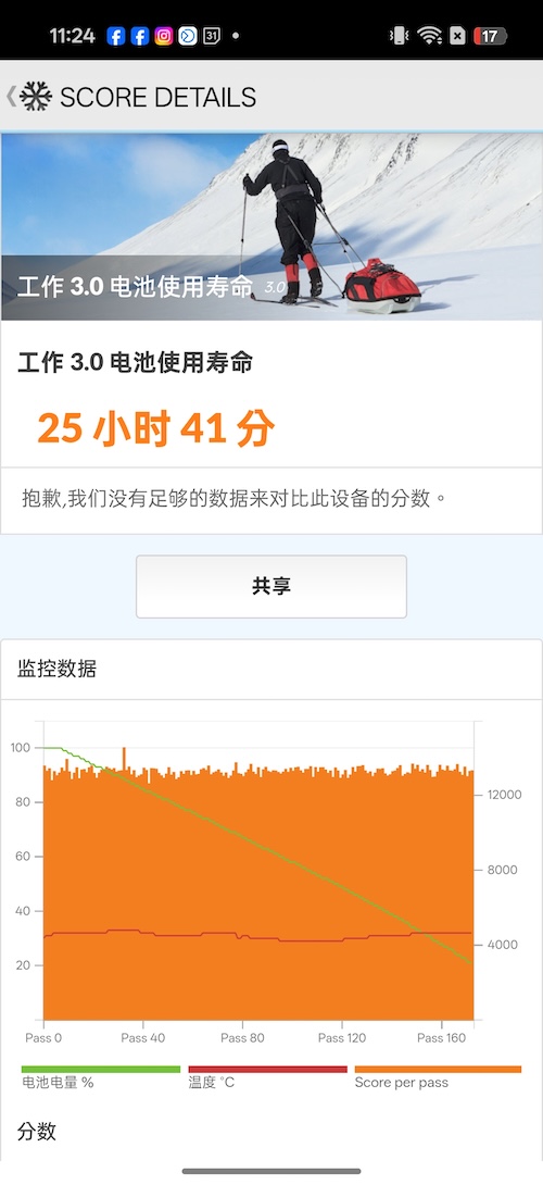 Find X9 Pro跑PCmark工作3.0,螢幕設為120Hz時跑電池使用壽命,長達25小時41分,完全發揮7,500mAh超大電量的優勢。我在有全日密集拍照的日子,滑社群、看短片,晚上回家時電量最低仍有約30%以上,若是一般使用情境甚至可達兩天一充。