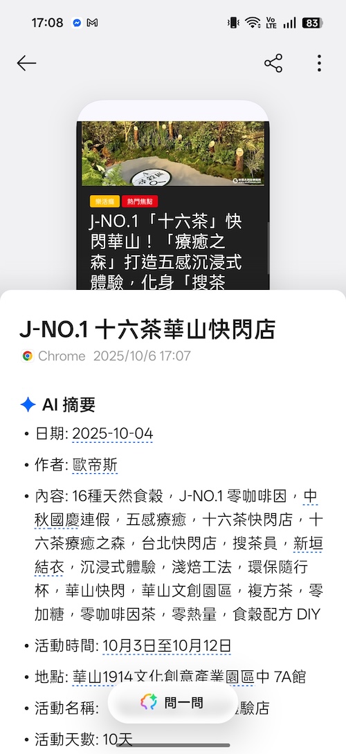 在網頁上快速捕捉的內容,若有日期、時間等資訊,可以一鍵快速新增行事曆,非常方便。還可以在下方詢問AI,AI會自動產生內容相關的問題,想要自己提問也可以。