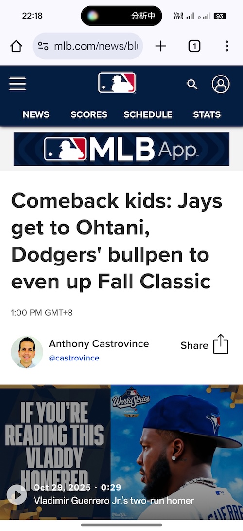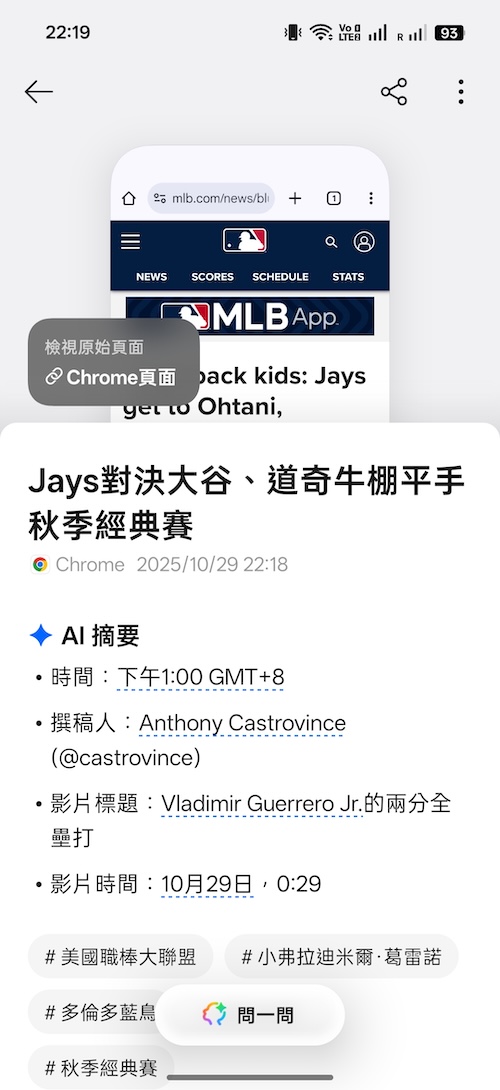 例如進入MLB官網按下閃記,按下方的「問一問」,即使是英文的網頁,也可以快速用中文來分析。