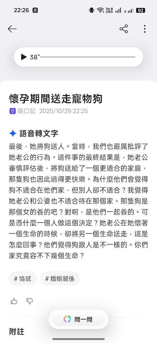 左側快速鍵按兩下進入錄音功能,按住不放可持續錄音,並將錄音的內容自動整理為文字,甚至能分析錄音的內容。