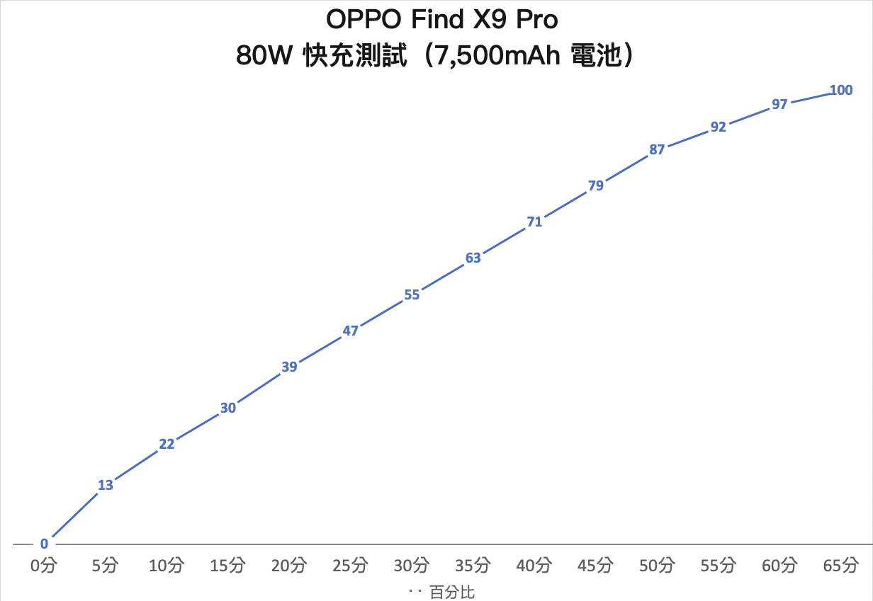 Find X9 Pro實測80W快充,大約65分鐘可充滿7,500mAh電池,30分鐘充約55%、45分鐘充約79%。
