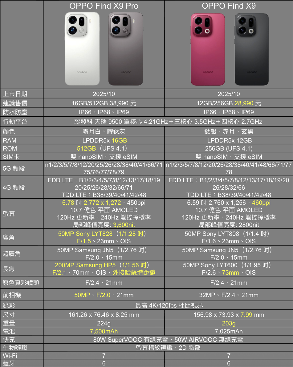 OPPO年度旗艦機Find X9系列在10月底上市,其中頂規款Find X9 Pro有霜月白、曜鈦灰兩款顏色,可惜國際市場沒有推出追光紅。對比前一代Find X8 Pro,Find X9 Pro在各方面都有升級,處理器從天璣9400升級為天璣9500(台灣首發天璣9500)、電池從5,910mAh大幅提升為7,500mAh、主相機從Sony LYT808(1/1.4吋)升級為Sony LYT828(1/1.28吋)、長焦從3x的Sony LYT600(1/1.95吋)與6x Sony IMX858(1/2.51吋)整合為一顆Samsung HP5(1/1.56吋),錄影升級為4K/120fps杜比視界,還多了一顆原色真彩鏡頭,讓夜景更還原、膚色更亮眼。
